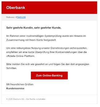 Dabei handelt es sich um keine Nachricht von der Oberbank! Klicken Sie nicht auf den Link und geben sich auch keine Zugangsdaten, Passwörter oder sonstige sensible Informationen an.