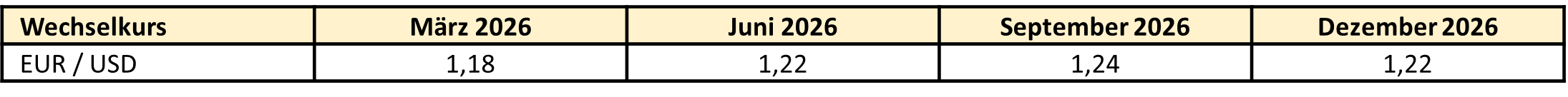 Nach dem Ende der Amtszeit von Fed-Chef Powell im Mai 2026 dürfte wohl jemand folgen, der Trumps Zinssenkungsfantasien teilt. Weitere Senkungen des Zinsniveaus werden zwar am Markt erwartet - eine politische Einflussnahme auf die Entscheidungen der US-Notenbank könnte jedoch zu einem massiven Vertrauensverlust an den Märkten führen und den Dollar gegen Mitte des Jahres belasten. Eskalationen beim Zollkonflikt könnten den Dollar ebenfalls schwächen während etwa die Staatsverschuldung und anhaltende politische Spannungen in Frankreich den Euro belasten könnte.